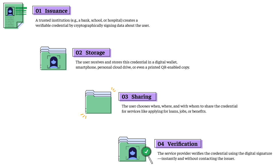 VCs are digital representations of real-world information such as income records, identity documents, academic qualifications, or employment history. Each credential is secured using cryptographic techniques4, which makes it tamper-evident and independently verifiable. This means a third party, like a bank or government agency, can confirm the authenticity of the credential without needing to contact the issuing institution.
