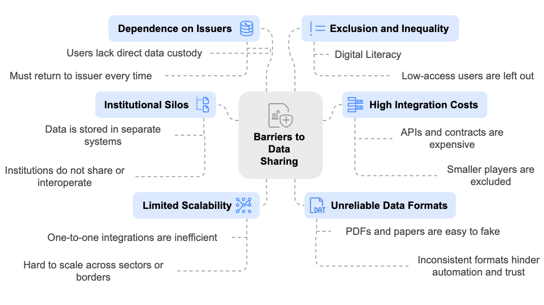 As systems became more digital, institutions began introducing portals and apps to help individuals interact with their data. However, over time, many institutions came to see this data as a competitive asset. To preserve control and maintain an advantage, they made it difficult for others to access the data, even when it rightfully belonged to the user. As a result, institutions rarely coordinate, and the data they hold is often inaccessible to the very individuals it concerns. Even when shared, it typically arrives in formats like PDFs or paper documents that are hard to verify and easy to manipulate. Institutions struggle to trust data they did not generate themselves, which leads to costly verification processes, delays, and frequent exclusion (World Bank, 2021). Sharing data across systems today often requires technical integrations, legal agreements, and real-time infrastructure, which makes the approach too complex and expensive for many smaller institutions (CDPI, 2025).