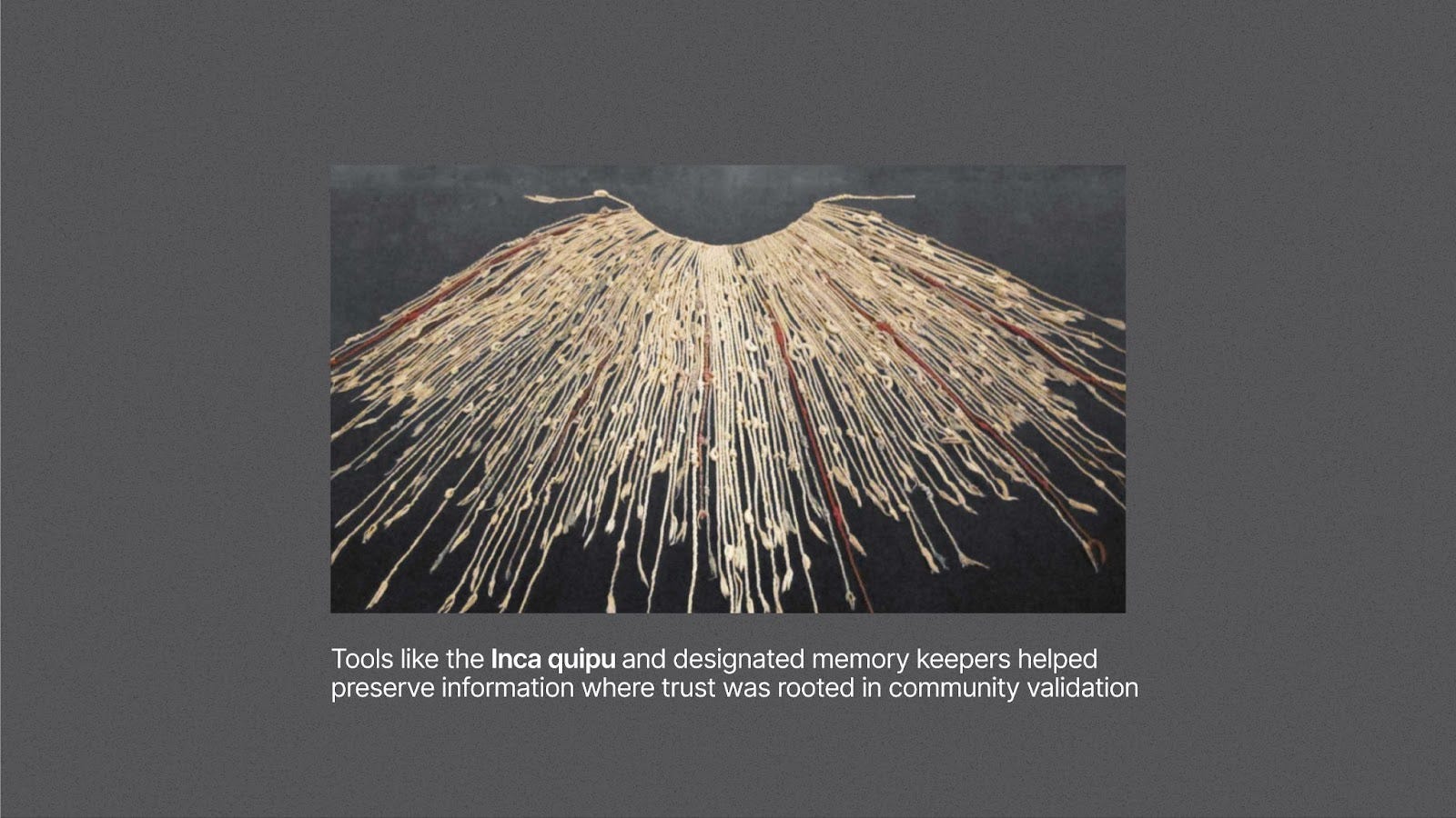 The instinct to preserve trustworthy records is as old as human society. In prehistoric societies, oral traditions and physical markers served as early memory systems (Assmann, 2011). Tools like the Inca quipu and designated memory keepers helped preserve information where trust was rooted in community validation (Urton, 2003). With the invention of writing, ancient civilizations like Sumer and Egypt transitioned to clay tablets and scrolls. Temple scribes and monarchs became custodians of truth, marking the beginning of institutional record-keeping (Goody, 1986; Oppenheim, 1964). Across the world, other innovations emerged as cultures developed their own trusted mediums and practices for preserving records.