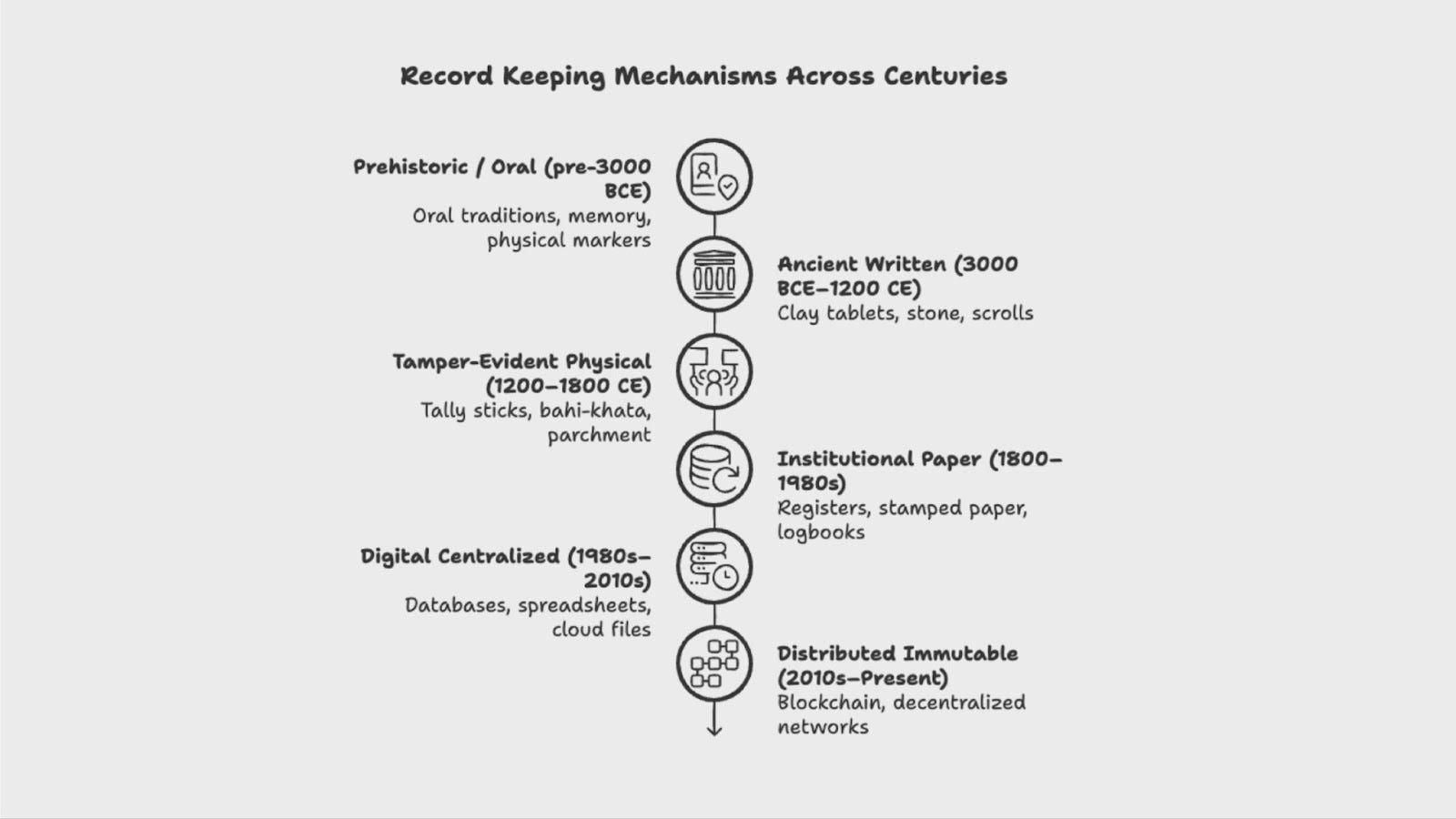 Throughout history, societies have evolved their methods of record-keeping. These began with oral memory systems, moved to tamper-evident physical tools like tally sticks, then to institutional paper records, and eventually to centralized digital systems. Each stage brought improvements in how quickly and reliably we could capture, protect, and share information.